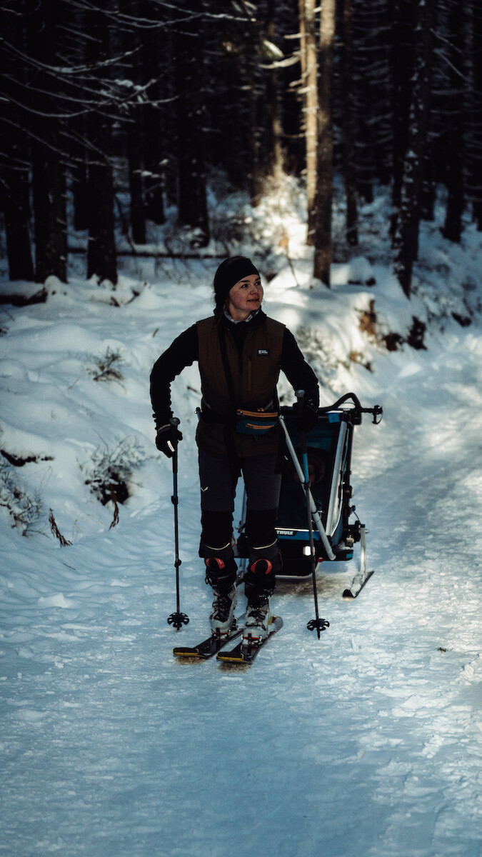 Z przyczepką idzie się naprawdę łatwo. Oczywiście, pod górę trzeba się nieco bardziej napracować, bo pojawia się waga dziecka, przyczepki i ekwipunku (u nas to ok. 30 kg – które wciągam za sobą). Ale nowy zestaw narciarski z wygodnym pasem i mocnym zapięciem robi robotę. Zjazd? No cóż, szusowanie slalomem odpada. Na stromszych terenach trzeba zjeżdżać pługiem. Osobiście traktuję wyjście na skitury z przyczepką jako prozdrowotne – spędzanie aktywnego czasu na świeżym powietrzu to dla mnie świetny trening. Dla dziecka to możliwość wychowywania się w bliskości z naturą. Na końcu trasy zawsze daję czas na eksplorację otoczenia i zabawę w śniegu. Po takiej wędrówce mamy szybki powrót dzięki zjazdowi na nartach, co pozwala nam wybierać nieco dłuższe szlaki. Jednak w przypadku skiturów to nie zjazd jest kluczowy. Mimo to bardzo to lubię, ponieważ możliwość wyjścia prostym szlakiem z dzieckiem w przyczepce zaowocuje w przyszłości dobrą formą do chodzenia na fokach. Jest to dla mnie naprawdę dobry i przyjemny trening. Bardzo polecam każdemu, kto lubi ten sport.